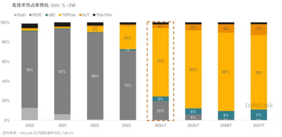 從“n型”技術路線市占率來看,2024年TOPCon已拿下70%左右的市場份額,按照InfoLink Consulting預測,到2025年TOPCon市占率將提升至80%。